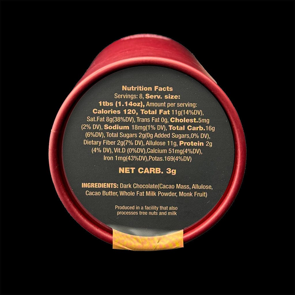 Ingredients: Dark Chocolate (Cocoa Mass, Cocoa Butter, Allulose, Whole Milk Powder, and Monk Fruit)